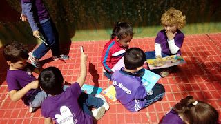 Los alumnos/as de 1º, 2º, 3º, 4º y 6º tenían el bingo-cuento. En esta actividad la tutora les daba un cartón de bingo en blanco y les ponía en la pizarra palabras extraídas de un cuento; ellos eligen las seis palabras que quieren y las anotan el cartón; acto seguido la tutora les lee el cuento en cuestión y los ellos deben estar atento y al oír las palabras del cartón las tienen que ir tachando. El primero/a que tache todas las palabras habrá ganado el juego.